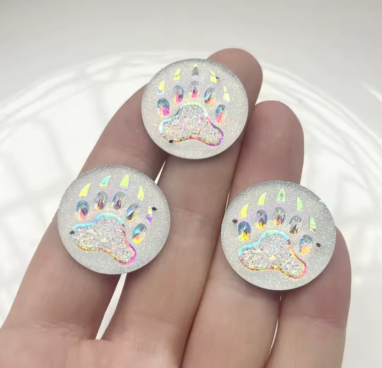 These 25 mm round resin flat backs showcase a distinctive bear claw pattern and come in a set of two pieces. Perfect for detailed craft projects and jewelry design, they combine unique aesthetics with expert craftsmanship.